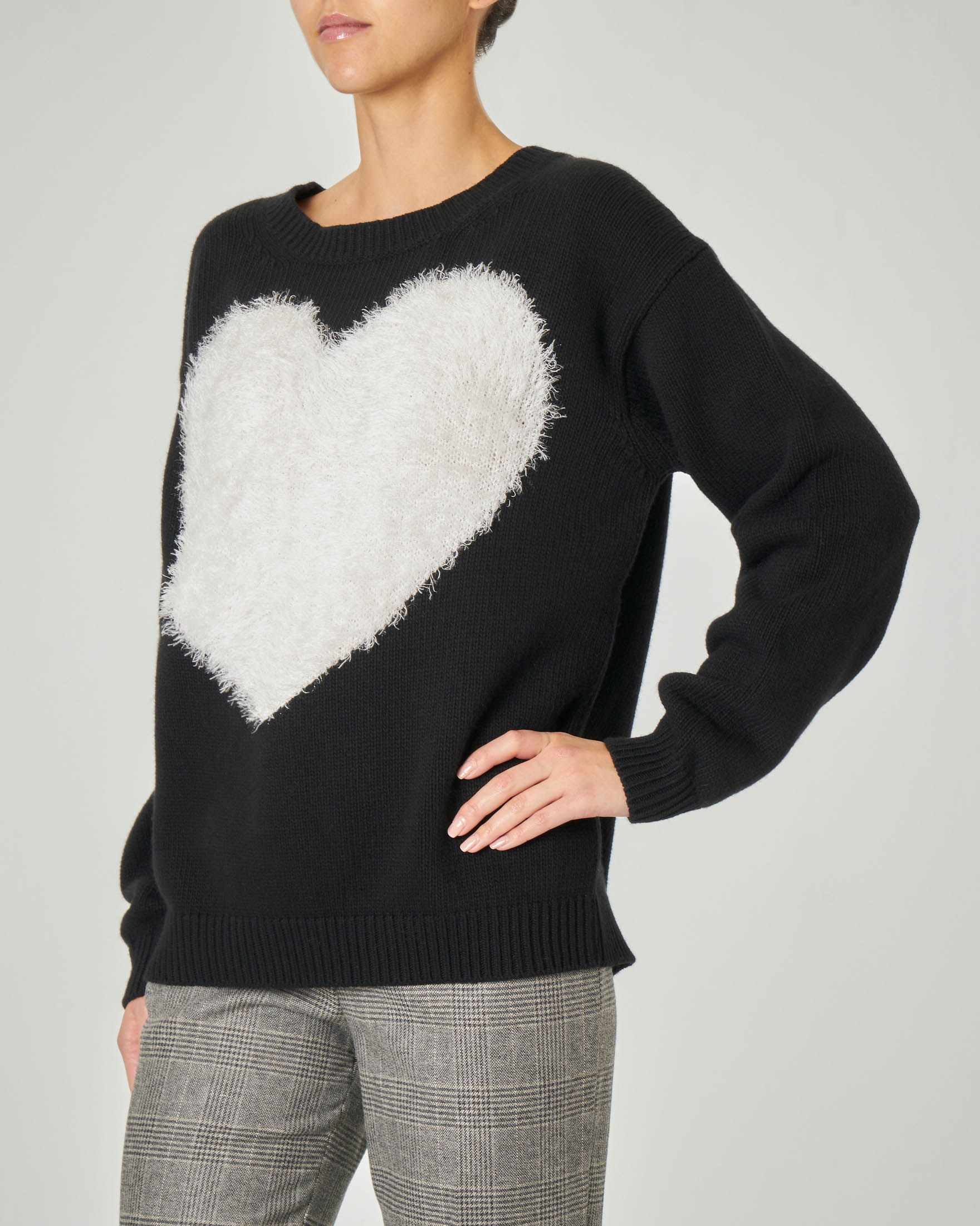 Maglia nera girocollo in lana misto cashmere con maxi cuore bianco in tessuto effetto mohair | Pellizzari E-commerce
